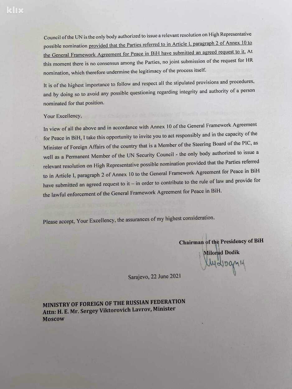“U svojstvu ministra vanjskih poslova zemlje koja je članica Upravnog odbora PIC-a, kao i stalna članica Vijeća sigurnosti UN-a, koje je jedino tijelo ovlašteno za donošenje relevantne rezolucije o mogućem imenovanju visokog predstavnika pod uvjetom da stranke iz članka I stavka 2 Aneksa 10. Općeg okvirnog sporazum za mir u BiH podnijeli su mu dogovoreni zahtjev – kako bi se doprinijelo vladavini zakona i osiguralo zakonito provođenje Općeg okvirnog sporazuma za mir u BiH”, zaključuje se u pismu.