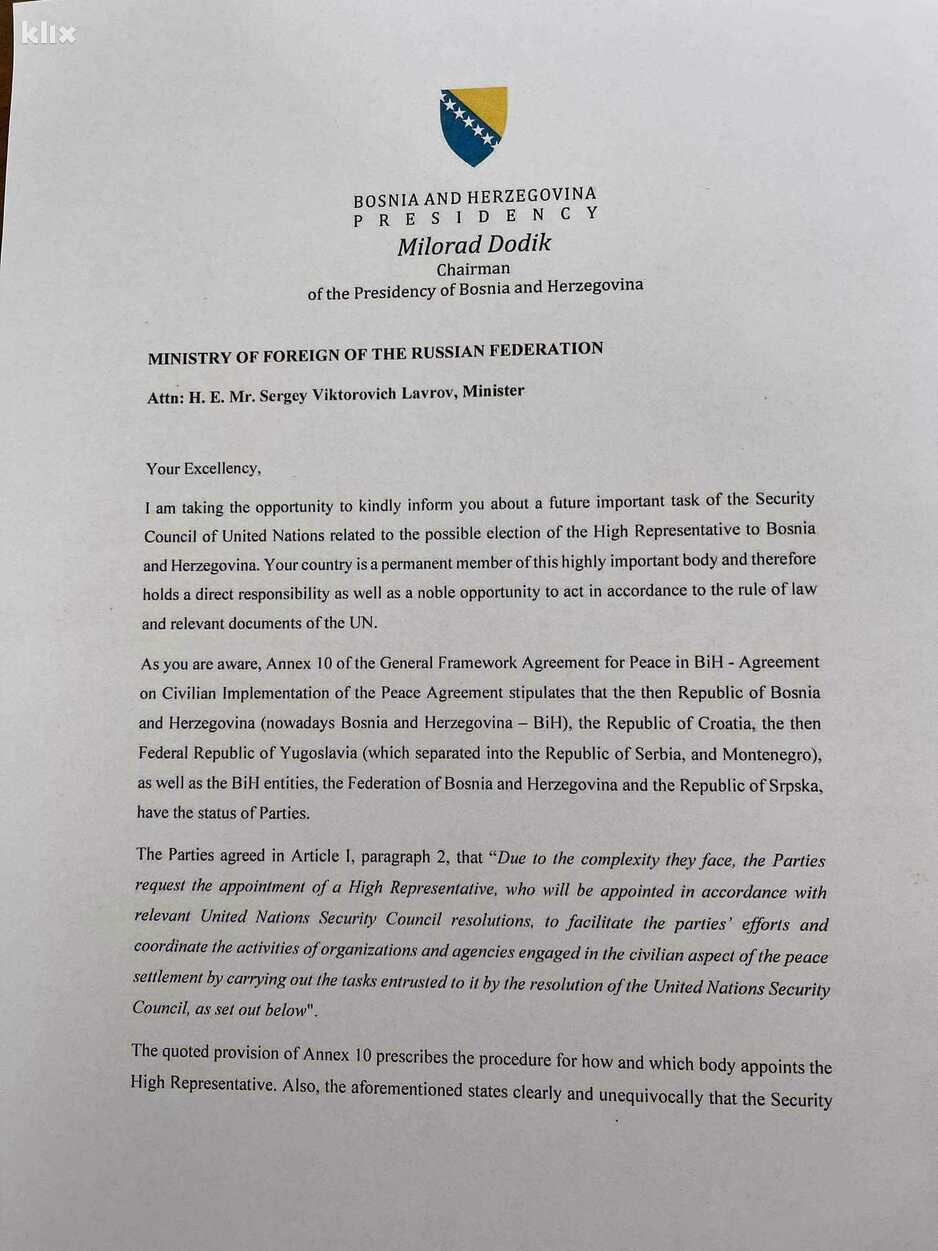 Kako stoji na početku pisma, Dodik Lavrova “ljubazno informiše” o budućem važnom zadatku Vijeća sigurnosti Ujedinjenih nacija vezanom za “mogući izbor” visokog predstavnika u Bosni i Hercegovini.